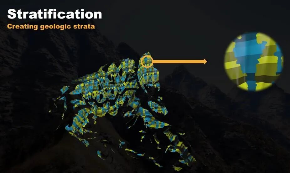 随后,还有一种有趣的现象是我们希望通过这些工具重现的,那就是地理分层。图中的这条黄线是岩石随着时间变化而形成的,为此我们打造了地层工具,每一层都是随机的,我们给每一层都有独特的ID,以便让这些地层做debug的时候更方便。