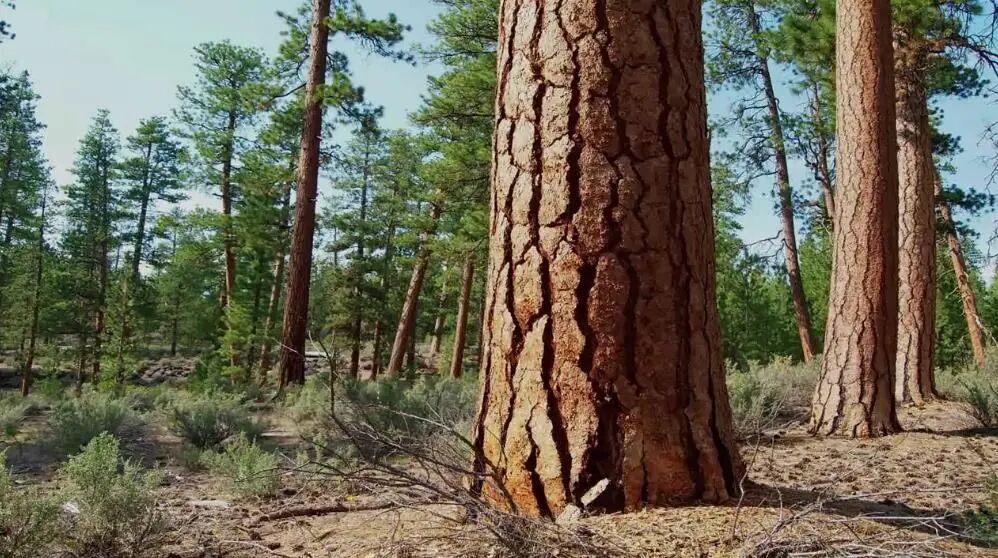 比如这个树皮皴裂的树干周围有一些枯枝分布,另外,这些树木产生的阴影也会影响其他物种的生长。