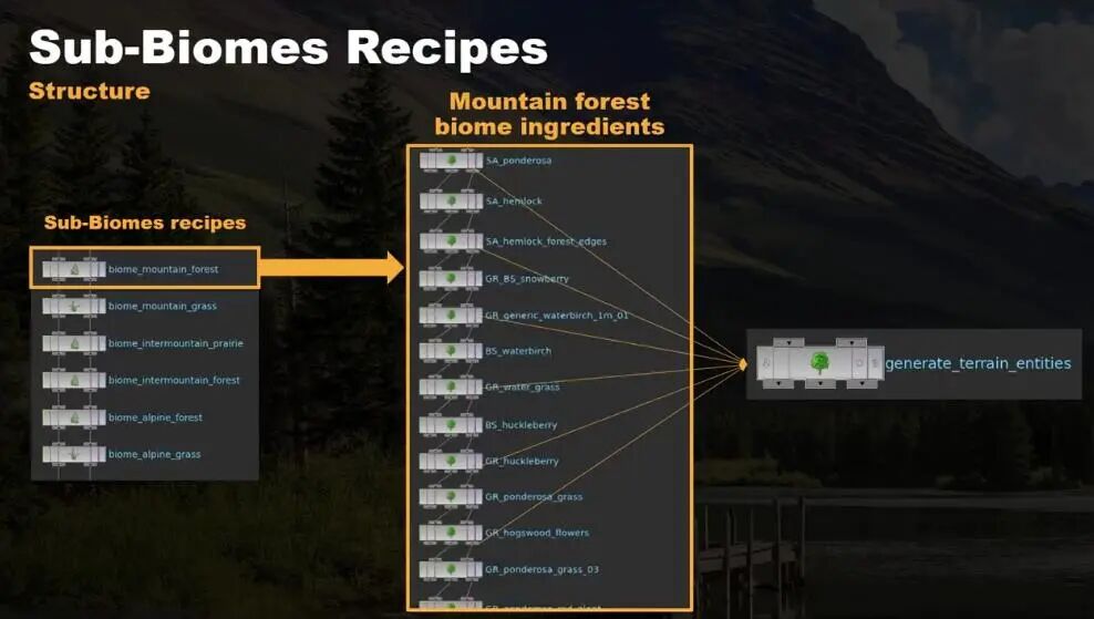 随后我们做了Sub-Biomes Recipes,它由很多部分组成,每一个都代表了不同的生物,比如森林、草地等,在这些biome的中心是generate terrain entities。