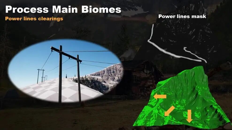 Main Biome还制作其他东西,比如生成的森林当中留出给用户放置电线的地方,我们可以看到power lines mask被加到了biome工具之上,以取代山区当中的数据和草地。