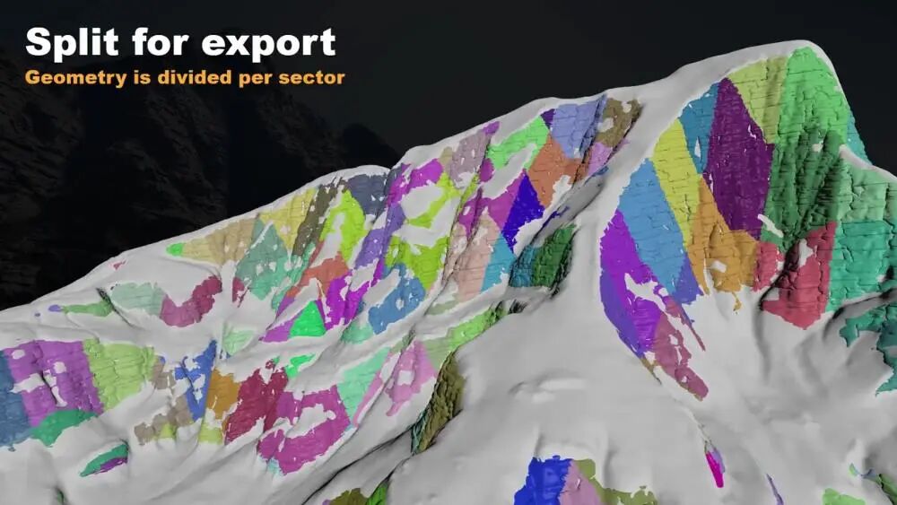 更精确的说,是每个扇区都有一个网格,如果你还记得,扇区的面积是64×64米,所以这里每一个颜色都代表了不同的扇区,我们这么做是为了更好的加载和流媒体传输,这就是悬崖网格部分。