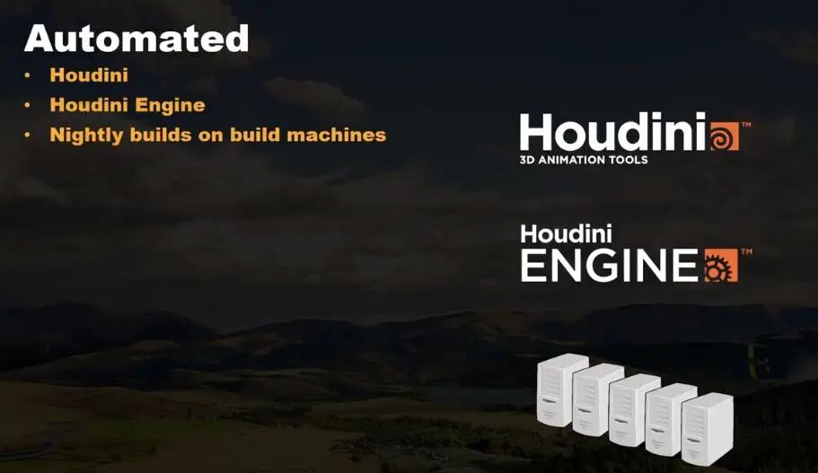 随后,这些管线需要是自动化的,所以我们使用了Houdini和Houdini引擎,以及在build machine上打造的一个Nightly build,后者主要用于每天晚上刷新游戏世界。我们有多个工具处理游戏世界里的不同部分,也就是地图。