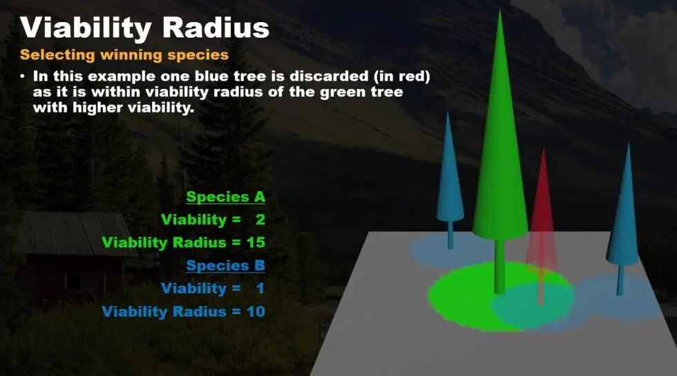 在选取获胜物种的时候,还会加入一个生存半径, 比如在这个案例中,如果蓝色物种生长到了绿色物种的半径之中,它就会被移除,也就是图中红色的物种。另外,我们也希望树底下有草丛,所以这些不会被移除。