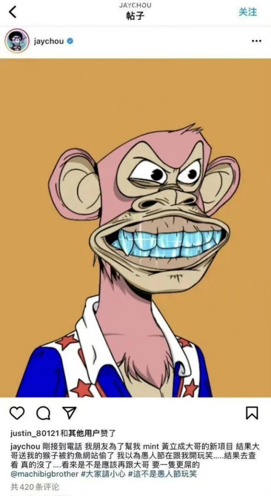 4月1日,周杰伦在Insgram上发文称,自己所持有的无聊猿NFT被黑客盗走,并说明“这不是愚人节的玩笑”。据悉,此次被盗走的NFT价值超300万元人民币。