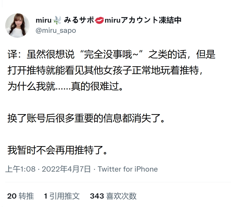 但这一切都在4月6日凌晨戛然而止——miru收到推特官方邮件说她的账号因严重违规而被冻结,她自己无法登陆,别人也看不到她账号页面的任何信息。甚至连她单纯用来分享美妆穿搭小物件的小号也收到波及被一并冻结。