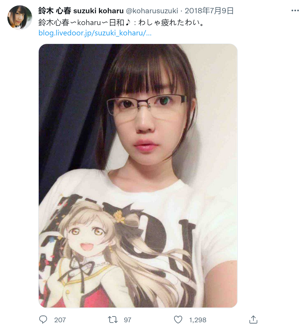 铃木心春说这张照片让自己看起来像一个宅女,衣服上的印花人物则出自《Lovelive!》,一部关于偶像的动画