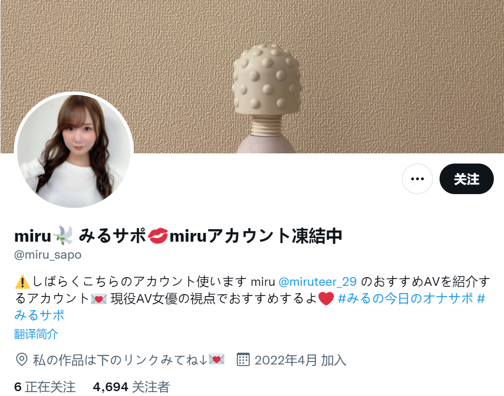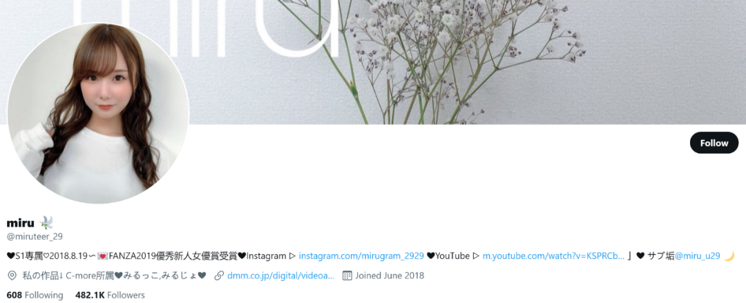如果不是简介里的自我介绍以及时不时转发自己的作品信息,miru的推特账号其实很难让人想到她的本职工作是一名成人片女优。