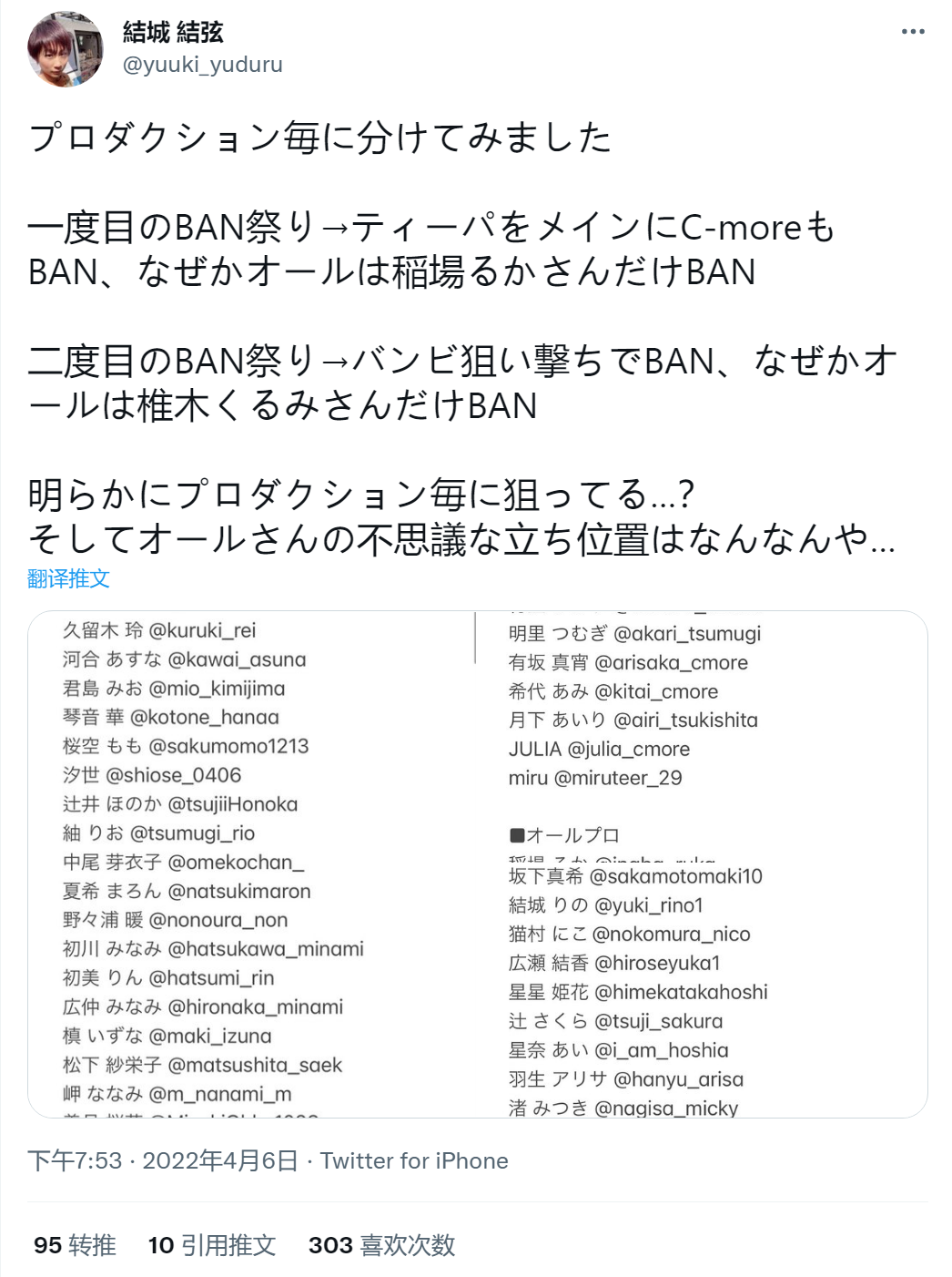 然而一天时间过去,不仅那些已经被冻结的女优账号没能恢复,还不断有其他人的账号陷入封禁,更多事务所被卷入其中,受害者名单越来越长……而推特方面对事务所及女优们的回应也是强硬而模糊,账号恢复重重受阻。