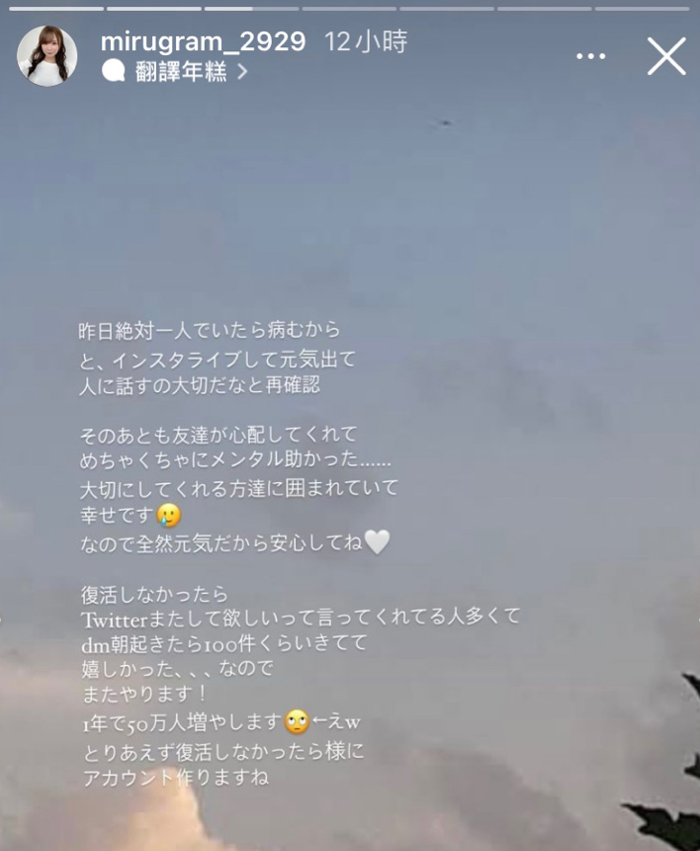 miru也在ins上说收到了很多人的鼓励和安慰,心情已经好了很多,她还乐观地表示,虽然老账号真不能恢复的话很可怕,但自己还是会坚持在推特用新账号和大家交流的,大不了就是花一年时间重新增加50万粉丝嘛。