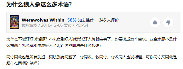 不仅如此,相比网杀(线下狼人杀),面杀(线上狼人杀)更是不断在抬升新入玩家的门槛。面杀玩家在游戏时除了分析其他玩家阐述的内容逻辑外,从面部表情和肢体行为上进行揣摩判断也是重要的一环,而网杀主要是通过聆听,更多的依靠语言进行推理,表演性质的缺失也让网杀难度骤升。其次还有大量的专业术语和约定俗成的规矩成为了新老玩家之间的隔阂,产生了两级分化的现象。这都让原本作为聚会游戏的狼人杀,娱乐性降低,竞技性变强。