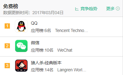嗅到商机的人也开始希望把这一线下娱乐推至线上。2017年初,诸多狼人杀APP如雨后春笋般涌现,方便、快捷、易组局等特点成为此类游戏应用的卖点,不少线上狼人杀APP下载量飙升,几个头部产品常驻在各大应用市场、游戏中心前列。
