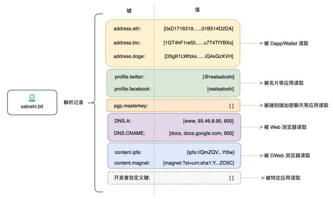 又由于与传统域名只能关联 IP 地址等有限的数据类型不同,去中心化“域名”支持关联任意的数据类型,由不同的应用去读取它所关心的数据,为用户提供不同的服务。比如在转账场景,钱包会读取“域名”下的区块链地址;在个人主页场景,个人主页应用会去读取用户的各种 Profile 信息;在端到端加密通讯场景,应用会去读取用户的公钥。对任意数据类型的支持,使得去中心化“域名”极具灵活性,可以很容易的在上面叠加应用。因此,去中心化“域名”的实用性,会被持续强化。