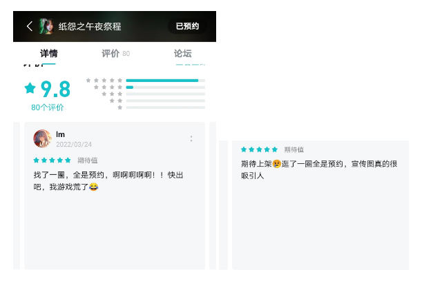 2022年Q1,中式恐怖游戏热度不减,多款中式恐怖游戏在PC端及手游端开放预约或上线,但是游戏评价呈两极分化。PC端steam上线有《三伏Demo》《黑羊Demo》《虫鸣》等,手机端有《纸嫁衣3》《怨憎会》等10余款冥婚游戏等,玩家评价中负面向一般为剧情拉胯、为解谜而解谜等,而正反馈则为希望时间直接快进到游戏发售日。