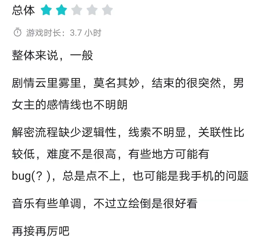 在印象中,似乎只要游戏被冠以“中式恐怖”,对于久旱逢甘露的玩家来说都是热烈欢迎。但从评论来看,部分游戏因剧情欠推敲,部分解谜思路、画面构图角色过于相似也成为玩家的吐槽部分,而部分游戏强行塞入广告,或者看广告也无法获得线索等问题,也很破坏游戏体验。