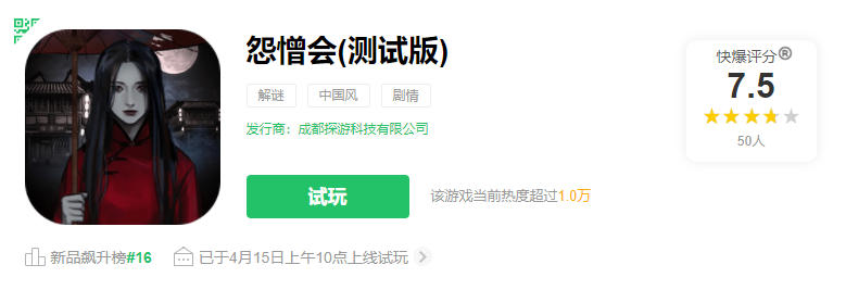 近日一款中式恐怖解谜手游《怨憎会》上线,Tap Tap游戏评分8.1,好游快爆评分7.5。抱着期待游玩后发现,发现这是一款较为熟悉的中式恐怖游戏,中规中矩,但也带来较少惊喜。