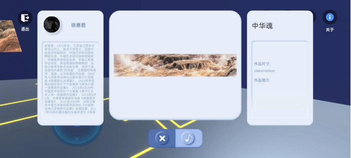 然后来到由著名画家徐惠君所打造的“听黄河涛声艺术馆”,该艺术馆分为上下两层,墙面上都是其黄河画作,点击画作会有作者简介和作品的实际规格,在元宇宙展馆中欣赏每一幅画作,感受黄河的艺术魅力。来到“游戏艺术馆”中,能够看到不少游戏人物的元素,据了解,该馆是由智度股份和三七互娱联手打造的“全国首个元宇宙游戏艺术馆”,双方将不定期举办元宇宙数字艺术展,并通过游戏元素植入、虚拟人物共建、活动联动等合作。