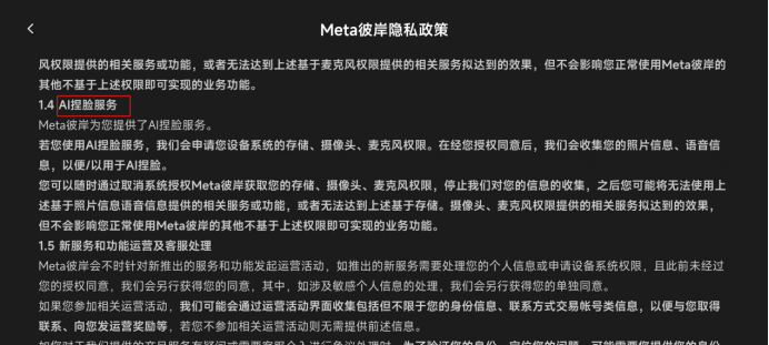 Meta彼岸中还有“发起语音”功能,速途元宇宙研究院还在体验中遇到未知网友发来的语音邀请,能够进行社交互动。在查看《Meta彼岸隐私政策》时发现,其中有AI捏脸服务,但在速途元宇宙研究院在体验中并未发现这一功能,询问Meta彼岸官方客服相关问题,截止发稿并未回复。