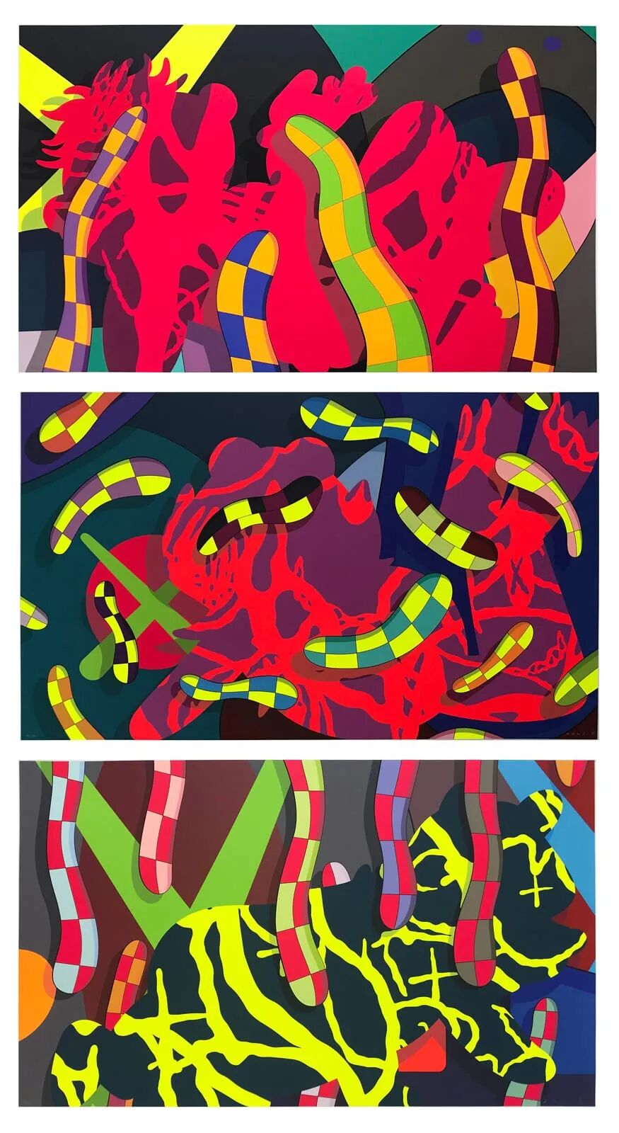 KAWS, “LOST TIME,” “ALONE AGAIN” and “FAR FAR DOWN” (2018),丝网印刷 , 32 x 53 英尺每幅, edition of 100.65000美元/套