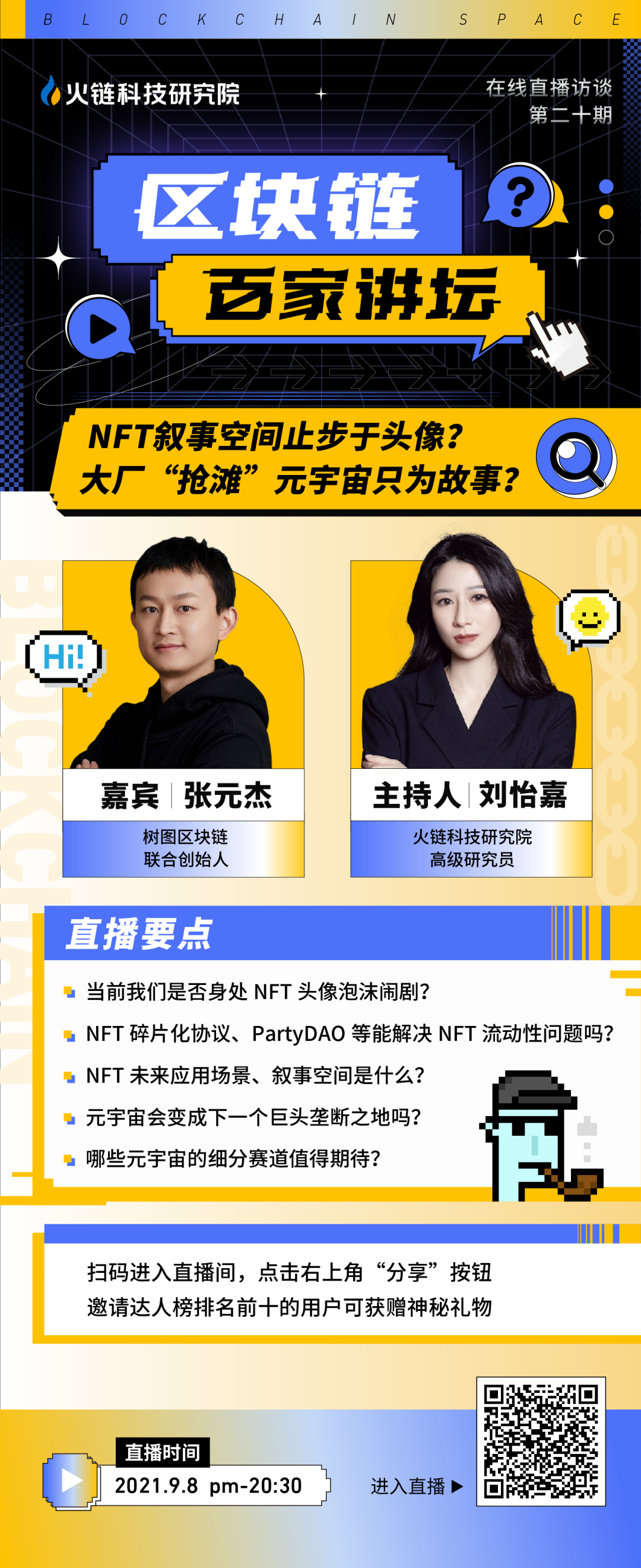 9月8日今晚 20:30,火链科技研究院将重磅推出第20期“区块链百家讲坛2.0”—— 《NFT叙事空间止步于头像?大厂“抢滩”元宇宙只为故事?》。
