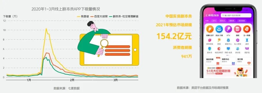 美团在《2021实体剧本杀消费洞察报告》中表示,根据平台数据及市场调研推算, 2021年中国实体剧本杀市场规模约为154.2亿元,消费者规模941万。