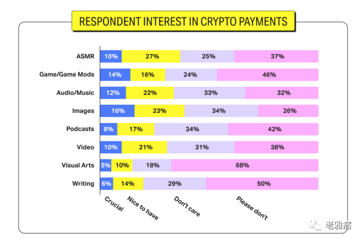 但创作者普查的反馈显示,43%的创作者强烈反对加密货币支付,而30%的人说他们不在乎。9%的人说加密货币支付将是至关重要的,而18%的人说加密货币将是很好的选择。