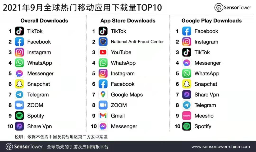 一方面,抖音海外版TikTok风靡全球市场。SenSor Tower最新数据显示,2021年9月抖音及其海外版TikTok以超过5900万下载量,蝉联全球移动应用(非游戏)下载榜冠军。力压Facebook、Instagram等超级产品。