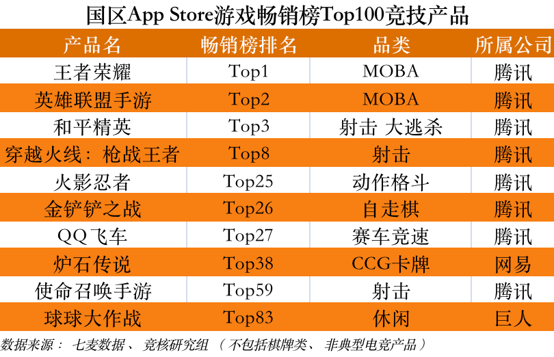 我们再将范围扩展至竞技手游品类,七麦数据显示,国区App Store游戏畅销榜Top100竞技类手游(不包括棋牌类、非典型电竞产品)约10款。其中腾讯占有8款,此外网易和巨人网络各有一款。