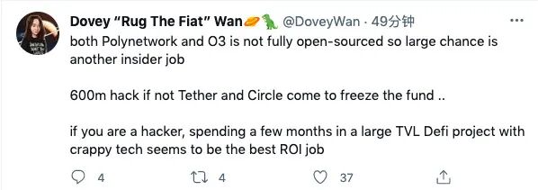 Primitive Ventures 创始合伙人 Dovey Wan 也表示:“Poly Network 和 O3(注:本次事件的另一大相关项目,下文会解释)都没有完全开源,所以这很有可能是一次内部攻击事件。”