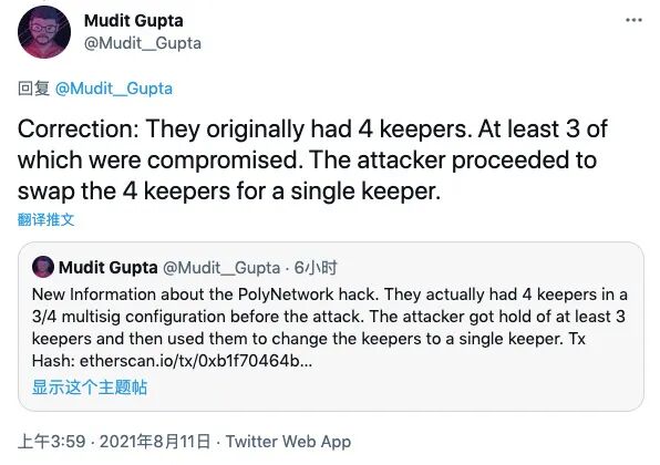 09:50 更新:上文提到的 Mudit Gupta 随后也对自己的分析做出了部分修正。Mudit 表示他并不认同慢雾的判断,但 Poly Network 起初确实是有四位 keeper,执行着 3/4 的多签配置,不过在攻击前,黑客控制了其中至少 3 个 keeper,并将其换成了单签,这也是为什么所有的黑客交易都只有一个 keeper 签名。