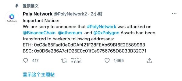 8 月 10 日 20:38,Poly Network 官方于推特确认了攻击事件,并贴出了黑客在不同链上的具体地址(见下文)。官方同时表示,为了追回失窃资金,Poly Network 将采取法律行动,敦促黑客尽快还款,希望相关链上的矿工及各大交易所伸手援助,共同阻止黑客地址所发起的交易。