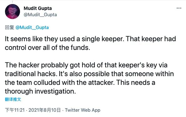 安全研究员 Mudit Gupta 则提出了另一个可能性,由于 Poly Network 的合约只有一个 keeper,除了黑客可能通过某种手段获取了密钥之外,也有可能是黑客与团队内部人员勾结完成了攻击,这需要更为彻底的调查。