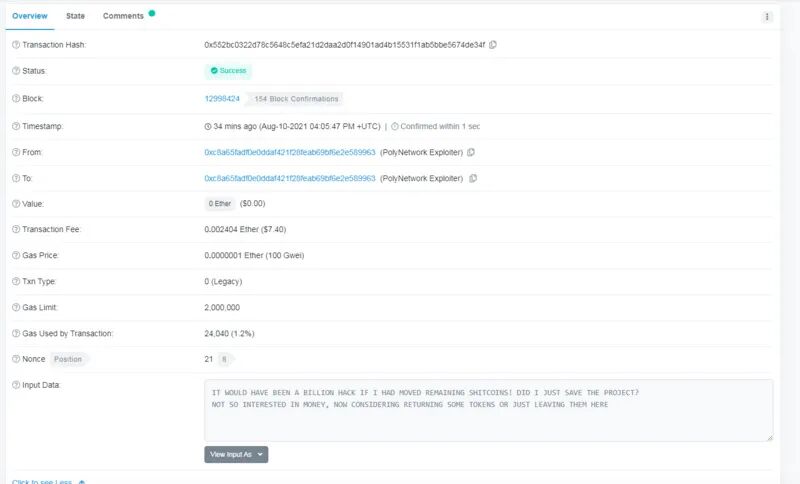 或许是感觉到了压力,黑客也在 8 月 11 日 00:05 通过一笔交易公开表示有意归还部分资金。与此同时,黑客还提出了一个新的可能,即利用这笔资金发行一个全新代币,并通过 DAO 的形式进行运作。