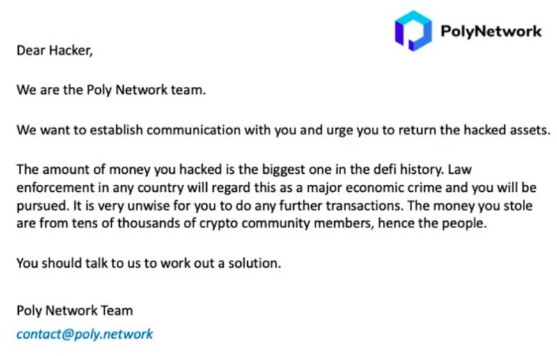 稍早前,Poly Network 官方再次通过公开信的形式向黑客喊话,强调数亿美元的资金在任何司法辖区都会是特大案件,希望借此向黑客施压,获得与对方沟通的机会。但截至发文,Poly Network 仍没有披露其他任何实质性的进展。