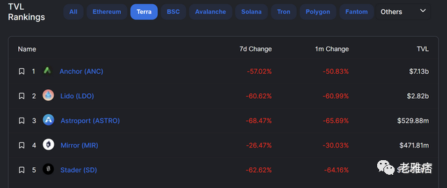 Luna的暴跌和UST的严重脱锚,给Terra生态带来了近乎毁灭性的打击,整个生态血流成河,TVL下跌45%并跌破130亿美元大关,头部几个协议的TVL也均惨遭减半。