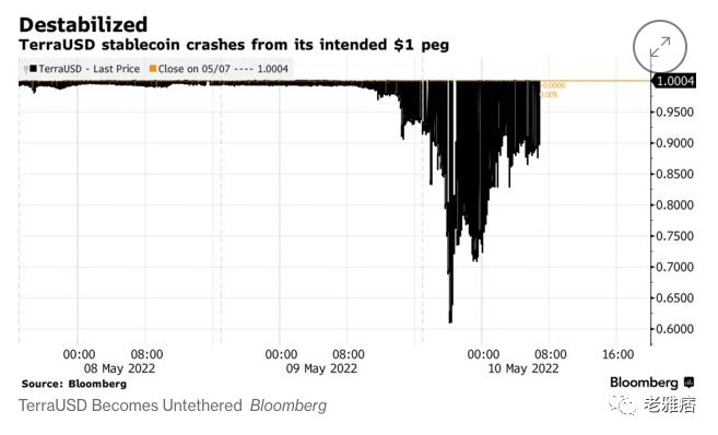 Terra USD 代币(或称UST)没有做到按照其设计的1美元对等挂钩价值,而是在周末滑落到99美分左右。到纽约时间的周一晚间,它已经暴跌到60美分,抹去了2021年5月的前低点92美分。它在周二扳回了损失,并在90美分和1美元之间波动--这是一个危险信号。
