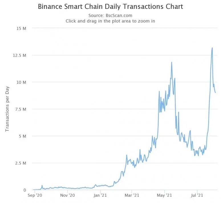 就在不久前,每条公链都试图挑战以太坊在 DeFi 领域的主导地位。在基于以太坊的视频游戏 “Axie Infinity” 一举成功后,区块链在价值 1000 亿美元的游戏行业蓬勃发展。在最新的公链竞赛中,币安智能链在日常交易量这一指标上,再次超越了以太坊。由于 PancakeSwap 的成功,BSC 之前在交易数量上超越了以太坊,PancakeSwap 是 BSC 上的一个去中心化交易所,当时正值 DeFi 热潮。然而这一次,币安的成功要归功于 BSC 上一款相对鲜为人知的游戏“CryptoBlades”。DeFi 数据跟踪公司 DappRadar 的数据显示,在过去 30 天里,超过 62.1 万名用户使用了“CryptoBlades”,而“Axie Infinity”的用户数量略高于 27.1 万名。7 月 31 日,币安首席执行官赵长鹏在推特上写道:“币安智能链昨天处理了超过 1000 万笔交易,而以太坊处理了 120 笔交易。”图 | 7 月底币安智能链日交易量突破 1200 万(来源:BscScan.com)