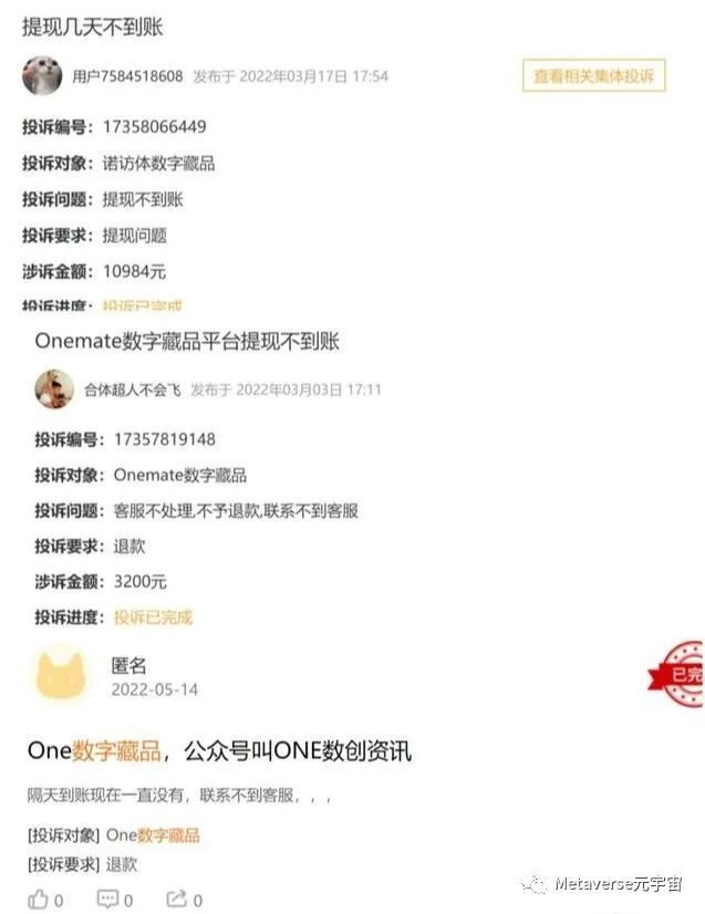 “做支付的从业者都清楚,现存数字藏品交易平台的资金风险很大,只有胆子大的支付公司才敢冒险做。”王宇说,支付公司存管的实际意义并不大,况且支付公司是不能做存管的账户的,背后的银行才是。根据投诉信息,数字藏品平台提现不到账相关事件并不是个例,被投诉平台包含诺坊体、iBOX和Onemate等。
