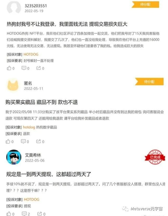 有用户反映,HOTDOG同样存在交易提现问题。根据投诉信息,除了提现延迟到账外,HOTDOG还涉及封号致使平台内充值的资金无法取出和拍得藏品不到账、延误退款等问题。