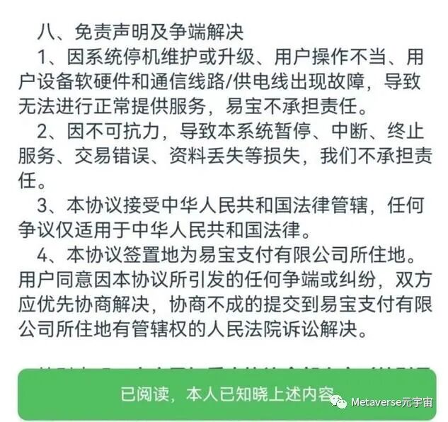 不过,高额收入背后也会承受相关风险,支付公司一般会在用户协议上把权责标记得十分清晰。易宝支付在钱包协议的免责声明中明确指出,1、因系统停机维护或升级、用户操作不当、用户设备软硬件和通信线路/供电线出现故障,导致无法进行正常提供服务,易宝不承担责任。2、因不可抗力,导致本系统暂停、中断、终止服务、交易错误、资料丢失等损失我们不承担责任。