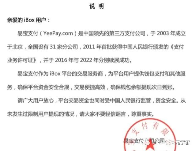 欧科链讯发现,当前的数字藏品平台也再次沿用了这一套做法。以iBOX为例,在支付方式上,除银行卡外,其还选择第三方支付平台易宝支付。为消除用户担忧,易宝支付还专门发布公告说明交易资金安全。