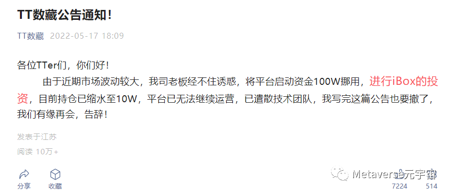 紧随象寻,“TT数藏”公号也发布公告称,因老板未能抵制诱惑,挪用平台启动资金投资iBOX数字藏品导致巨额亏损,平台已无法运营,技术团队也同样被遣散。数字藏品平台的员工从幕后走向台前,夺取官方渠道为维权发声,由此可窥见数字藏品市场混乱中的众生相。
