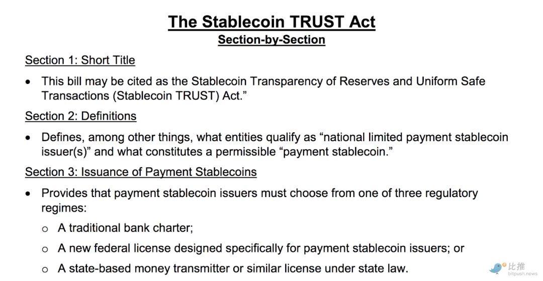 TRUST 法案将适用于法币支持的托管稳定币,将只允许三种类型的实体发行支付稳定币:(1)根据州银行法授权的汇款业务,(2)受保的存款机构,以及(3)一种称为“国家有限支付稳定币发行商”的新型实体。