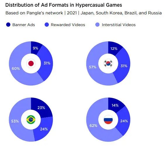 超级休闲游戏中最常见的广告形式包括插页视频、奖励视频和横幅广告。据Pangle的数据,在2021年,插页广告是日本、韩国、巴西和俄罗斯采用最多的广告形式,其次是奖励视频和横幅广告。与日本和韩国相比,横幅广告在巴西和俄罗斯更容易被接受。有些游戏会在核心玩法旁边放一个浮动的盒子作为原生广告,因为大多数超休闲游戏的玩法都非常简单,所以广告位置并不会影响游戏体验。