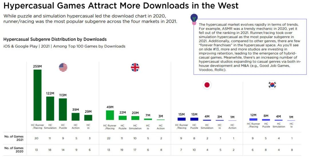 首先,超休闲是2021年下载量排名第一的手机类型,比起东方(日韩市场),超休闲游戏在西方(欧美市场)更受欢迎——在欧美、日韩四个主要市场的2021年下载量排名前100的游戏中,美国和英国约有一半是超休闲游戏,而日本和韩国只有20款左右。