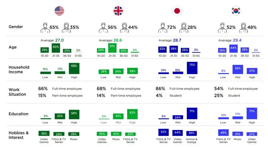 在欧美、日韩四个主要市场中,超休闲玩家的人口统计学特征是相似的——偏向于男性,是全职员工,有中高收入,喜欢电影、电视剧和电子游戏。同时在所有手机游戏玩家中,欧美、日韩市场的超休闲玩家更倾向于年轻玩家,虽然手机游戏玩家的平均年龄在33岁左右,但超休闲玩家更低,平均年龄不到30岁。