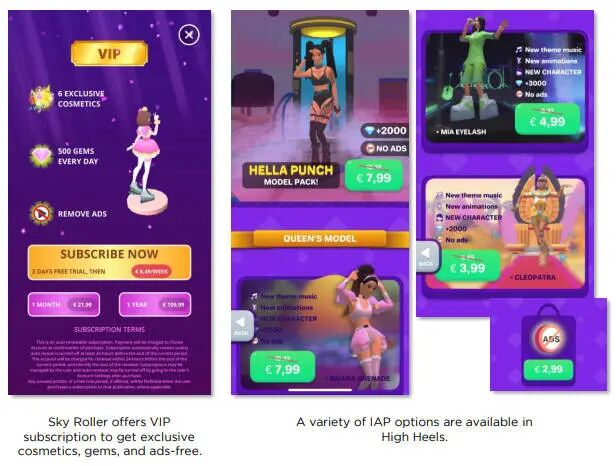 除了IAA的收益,越来越多的超休闲工作室开始直接向消费者收费。在超级休闲游戏中,提供付费移除广告的选项已成为一种常见做法,通常价格在2至3美元之间。此外,一些超级休闲游戏开发商试图通过订阅和iap赚钱,如Homa Games的《Sky Roller》和Rollic的《High Heels》,这些订阅/iap不仅会移除广告,还会解锁新内容、独家道具或额外的游戏内置货币。
