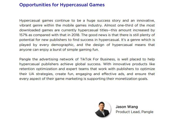 对于超休闲游戏未来的发展机遇,Pangle的产品负责人,Jason Wang认为,在手机游戏行业中,超休闲游戏仍是一个巨大的成功故事,也是一个创新且充满活力的题材。目前下载最多的游戏中,近三分之一是超休闲游戏——与2018年相比,这一数字增长了157%。