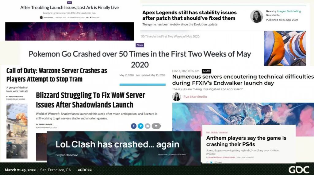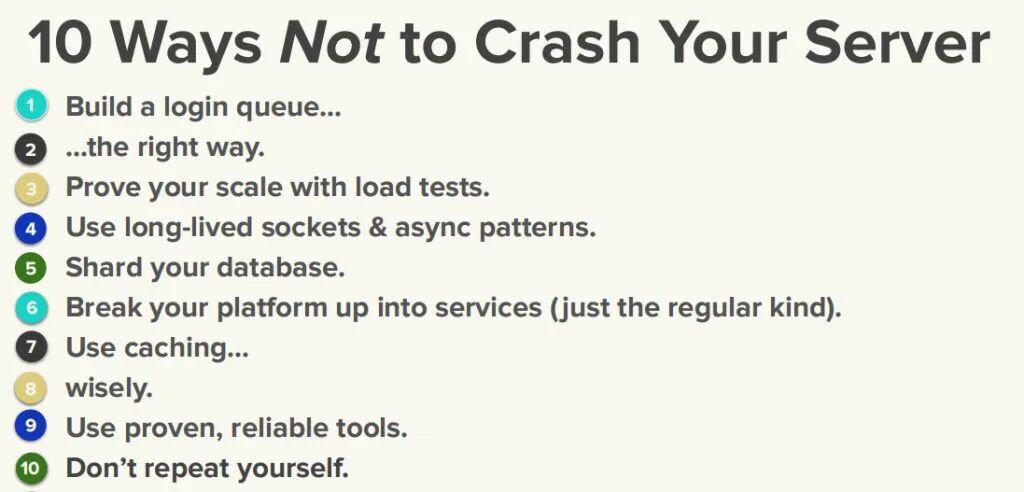 虽然很难得到确切数字,但至少有60%-70%的玩家如果在发布当天不能玩游戏,他们是不愿意再碰这款游戏的,因此发布当天的服务器稳定性是非常重要的。所以,我们基本上就是分享一些错误的做法,然后分析我们可以对此做些什么。