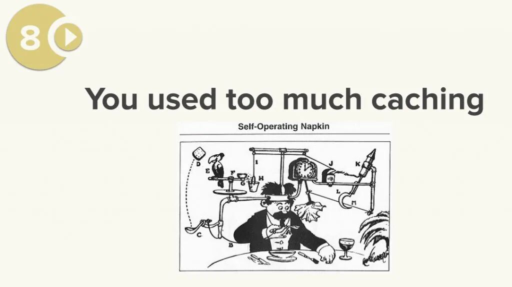 如我们刚讨论的那样,缓存可以是个很好的工具,但有些时候我们会做过头。如果缓存太多数据,你自己甚至都不清楚某些数据是否已经过时,唯一的方式就是回到数据库验证。但由于优化的东西太多,你会逐渐失去控制,不知道哪些数据来自哪里,让你的团队很难不产生bug的情况下做出改动。