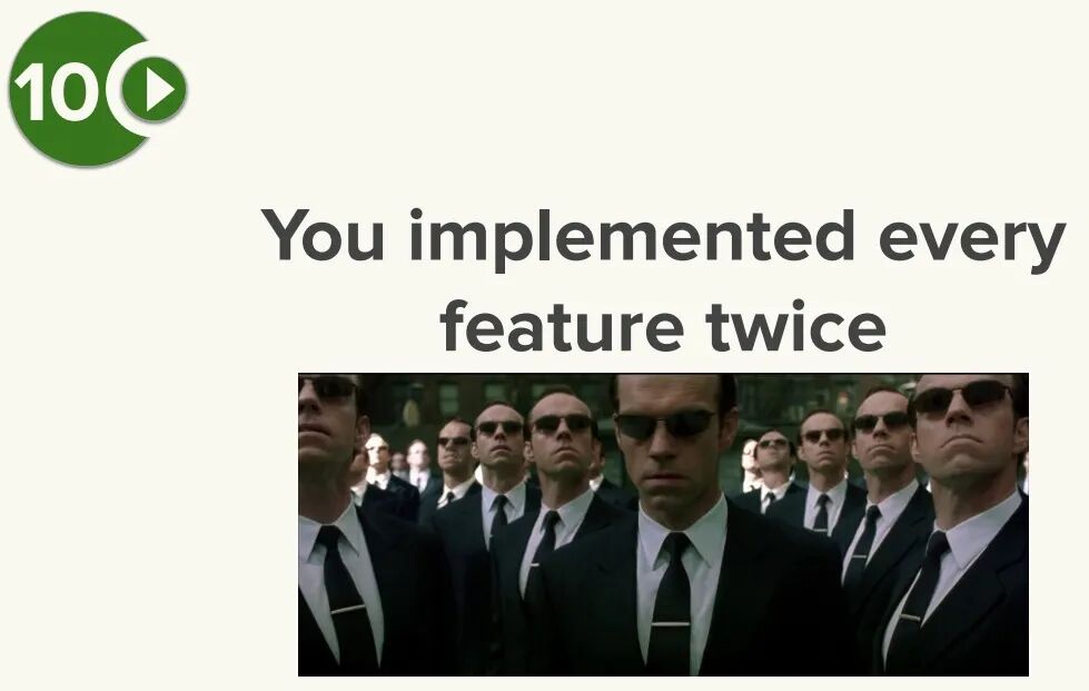 这里我们说两个现象,一是不断重写功能,还有一个是在代码库里对同一个功能有多种呈现方式。这样的代码库很难维护,会导致很多质量问题,还会影响服务器扩容。我们都知道简单就是最好的,但有时候,过于追求简化也是很困难的。你希望丢掉所有不必要的东西做到极简化,但还要考虑是否有时间去做。